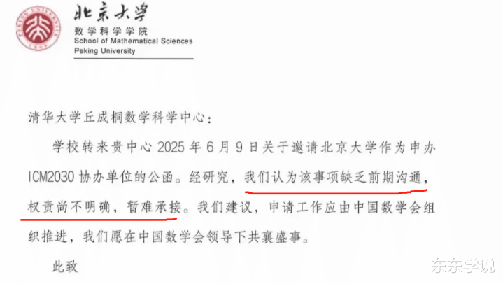从函件的内容看,北大拒绝的理由是事前缺乏有效沟通,且责权不明确。南大拒绝的理由与北大差不多,也是缺乏沟通,说建议由中国数学会牵头申办,他们会共享盛事!说明两校都不服由清华大学牵头申办或者举办!