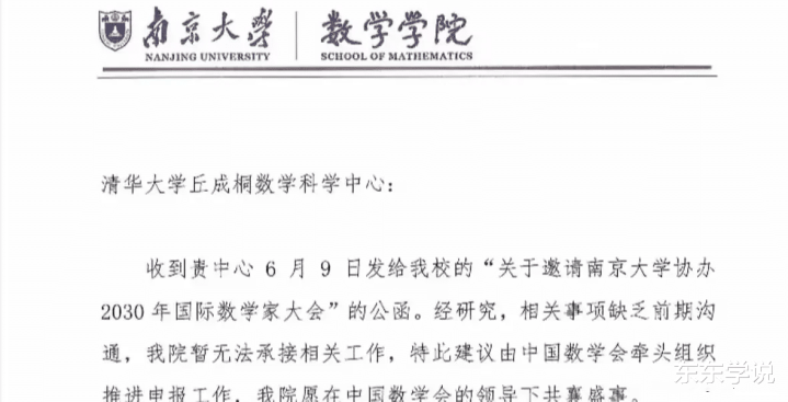 南大拒绝协办,从函件内容看应该是缺钱,是否真的缺钱呢?肯定是表面理由;后面的希望由中国数学学会牵头,他们就愿意协办的说法看,这才是他们拒绝的理由。由此可见南大应该是不服气由清华大学牵头申办ICM2030。